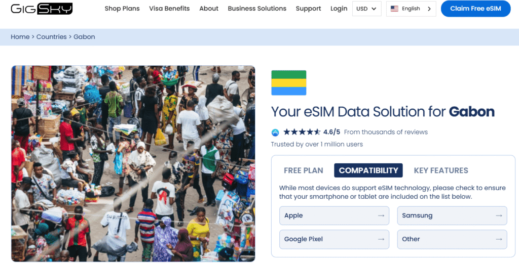 Nomad | 4.4/5 | $9.50 (1GB/7days) | Popular local & regional networks | 1GB (7 days), 3GB (30 days), 5GB (30 days), 10GB (30 days) | Budget-conscious travelers visiting Gabon’s urban areas and tourist hubs |