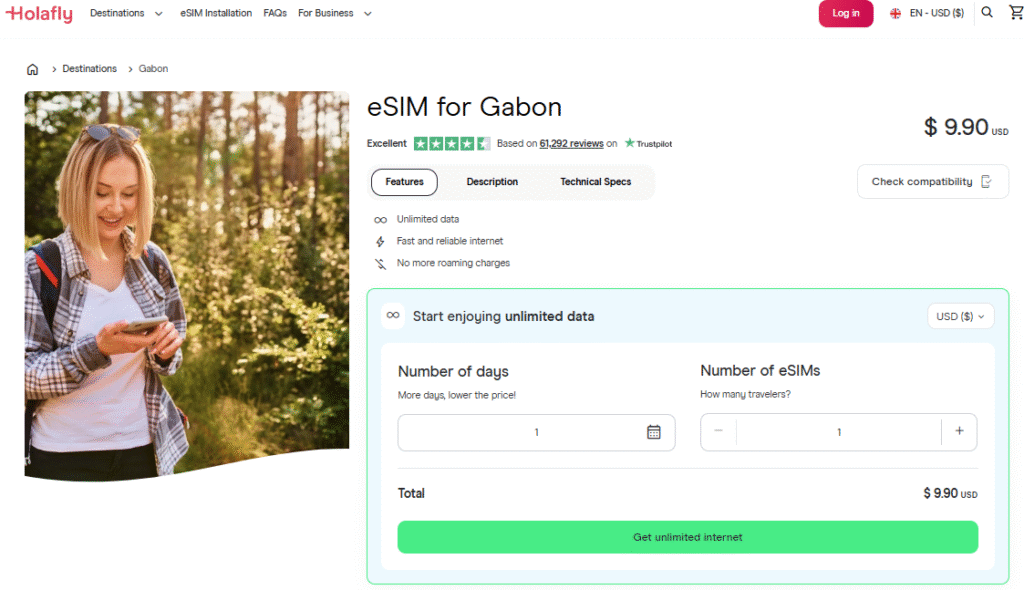 Holafly is known for its easy, plug-and-play activation. Just scan a QR code and you’re online. The company offers flexible, country-specific eSIMs that deliver reliable coverage in Gabon’s main cities, including Libreville and Port-Gentil. With fast urban data speeds, broad device compatibility, and straightforward setup, it is a convenient option for travelers.