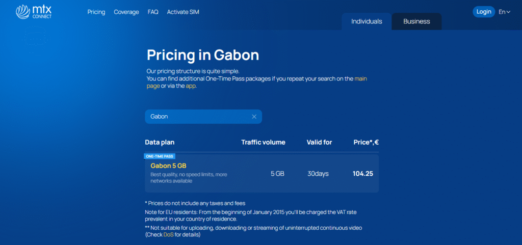 MTX Connect provides eSIM plans that are easy to set up and use across Gabon. It delivers strong coverage in Libreville, Port-Gentil, and along main highways, ensuring reliable data for maps, social media, and online bookings.