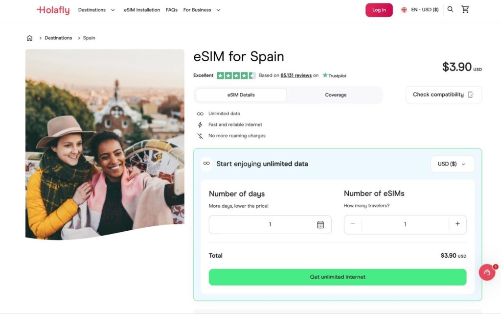 Holafly is the best eSIM for Spain if you want unlimited data and zero setup stress. It’s perfect for tourists who prefer seamless connectivity from the moment they land.