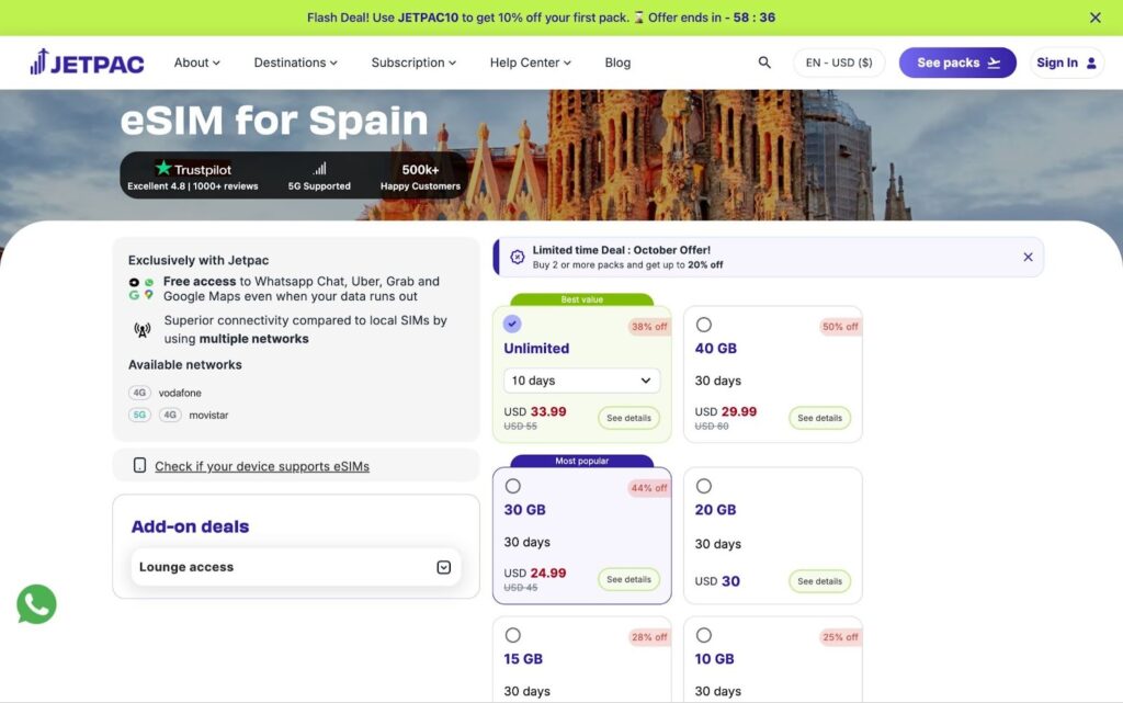 Jetpac is one of the most affordable eSIMs for Spain, designed for short trips and budget-conscious travelers.