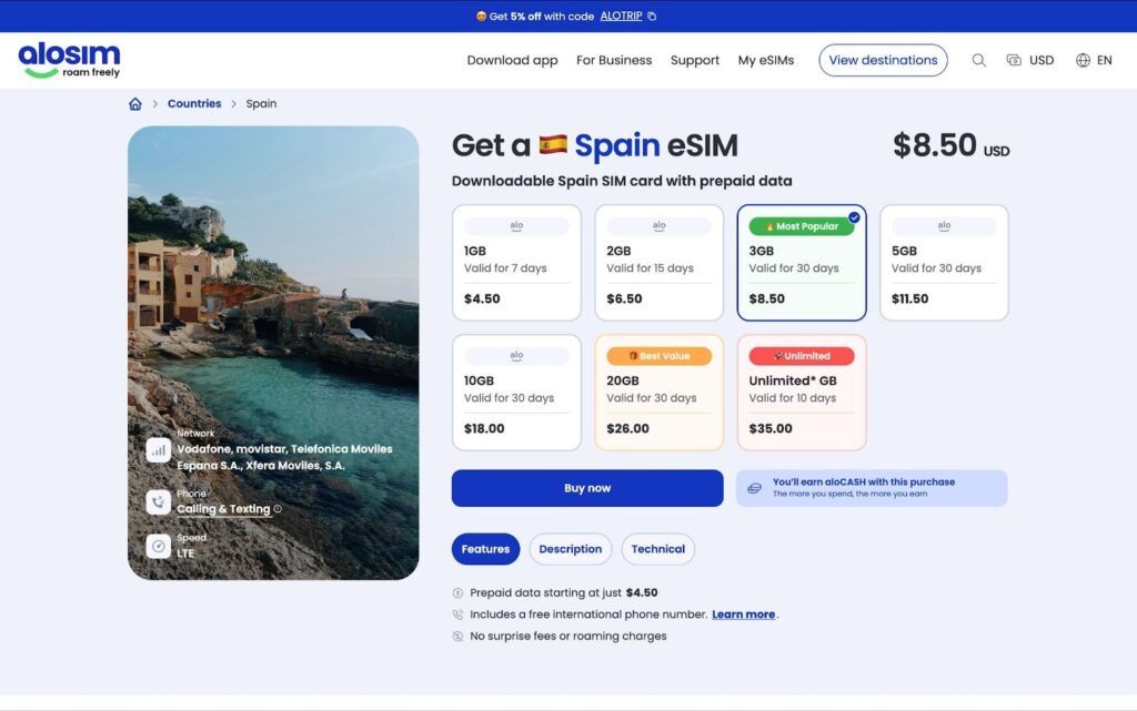 aloSIM stands out for offering both data and communication features, making it one of the most complete eSIM options for Spain.