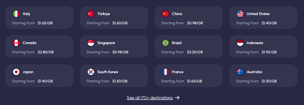 1. Überprüfen Sie die Abdeckung Stellen Sie sicher, dass der Anbieter das Land oder die Region, die Sie besuchen, unterstützt. Für Reisen in mehrere Länder entscheiden Sie sich für einen internationalen oder regionalen eSIM-Tarif.
