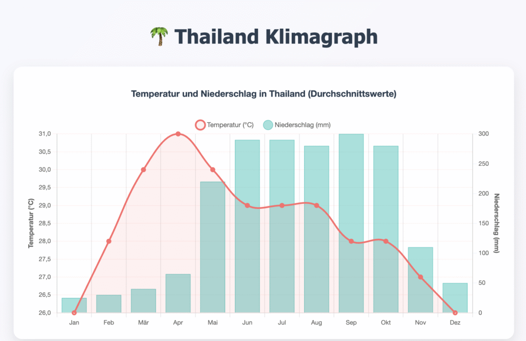 Thailand hat ein tropisches Klima mit drei Jahreszeiten: Trockenzeit, Regenzeit und kühle Saison. Jede Jahreszeit unterscheidet sich ordentlich in Temperatur, Luftfeuchtigkeit und Niederschlag, was die Reisebedingungen in verschiedenen Landesteilen beeinflusst.
