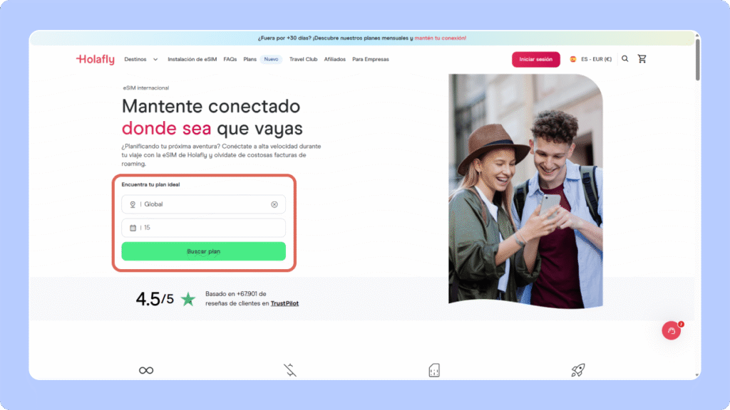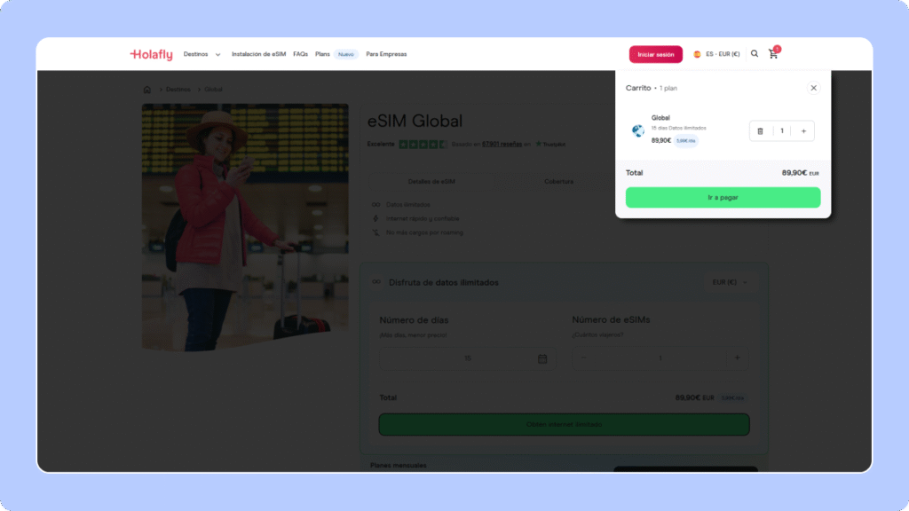 Ingresa a Holafly.com y usa el buscador para encontrar el país al que viajarás. Selecciona el plan eSIM que más te convenga según los días y la cantidad de datos que necesites.