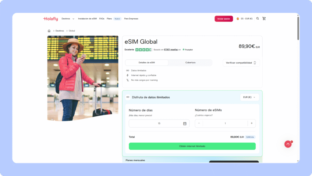 • Aprovecha el soporte en español 24/7. El equipo de Holafly está disponible todo el día para ayudarte con la instalación o activación, algo especialmente útil si viajas por primera vez.