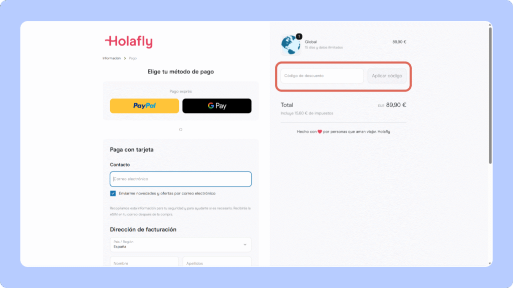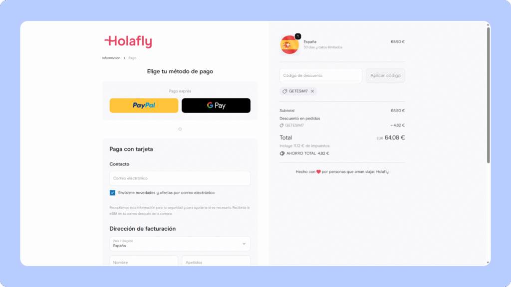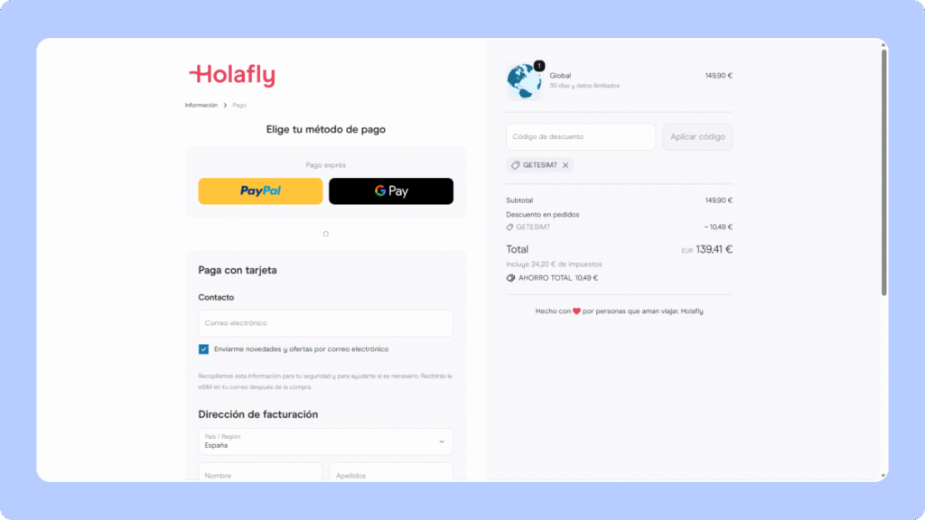 Verás reflejado automáticamente el 5 % de descuento en el total. Completa los datos de pago y confirma la compra. ¡Tu eSIM Holafly llegará de inmediato a tu correo electrónico!