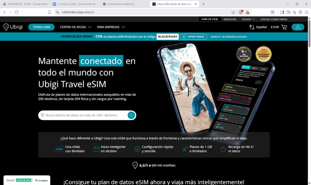 Airalo tiene un TrustScore de 4,0/5 basado en unas 13.700 reseñas en Trustpilot, mientras que Ubigi alcanza un 4,1/5 con más de 29.000 opiniones, reflejando una percepción similar de los usuarios sobre la fiabilidad y facilidad de uso de cada eSIM.