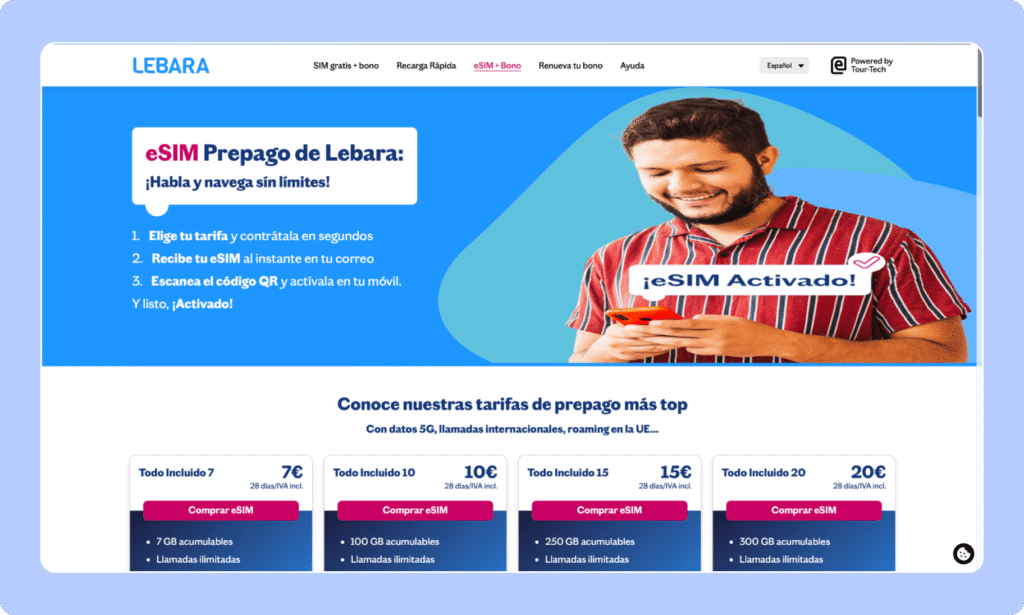 Si te quedas varias semanas en España y necesitas roaming, Lebara gana por goleada en precio por GB. Sus planes prepago de 28 días con cientos de GB y llamadas incluidas salen mucho más baratos que cualquier eSIM de viaje, aunque a cambio pierdes la experiencia “plug & play”.