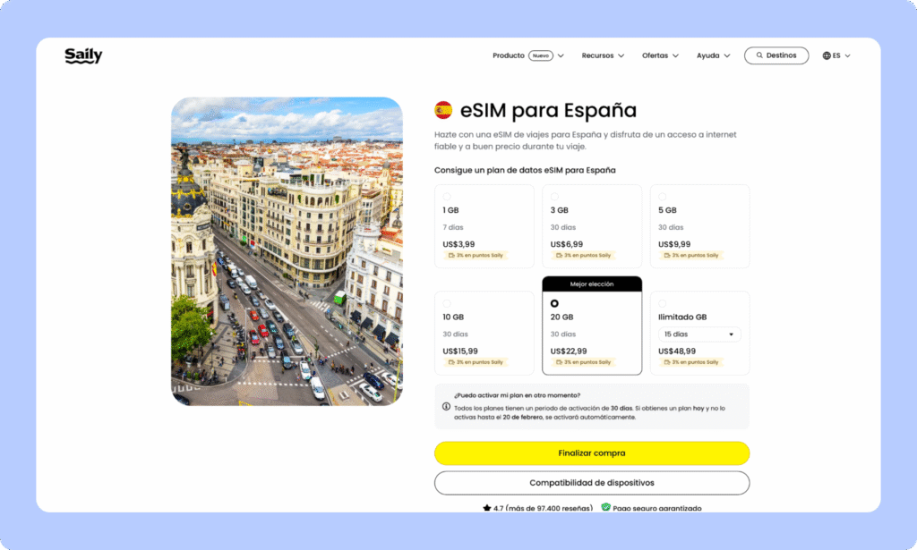 Saily puede servir si solo necesitas datos básicos durante unos días en España y quieres gastar lo mínimo posible. Para cualquier uso más exigente (viajes largos, mucho consumo, hotspot frecuente o trabajo remoto) hay opciones claramente mejores en esta comparativa. Es funcional, pero no destaca.