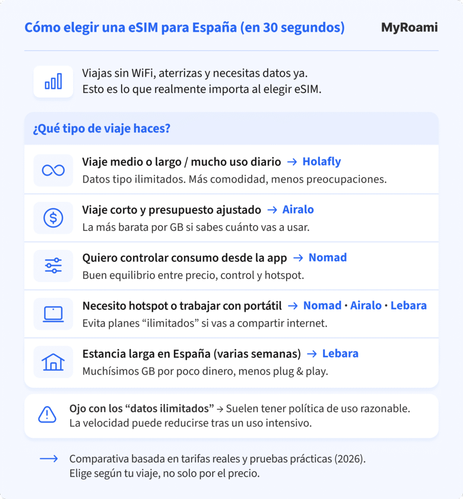 Por eso, la mejor eSIM para España no es la misma para todo el mundo. Depende de la duración del viaje, del consumo de datos y de si necesitas compartir conexión.