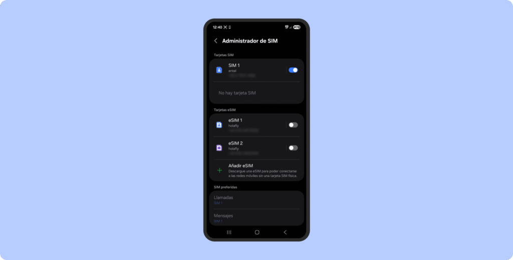 Además de la opción Añadir eSIM, puedes encontrar los interruptores a la derecha de cada una para activarlas según prefieras. Asimismo, bajo la etiqueta SIM preferidas, puedes elegir cuál eSIM o SIM dedicar a Llamadas, Mensajes o Datos móviles.