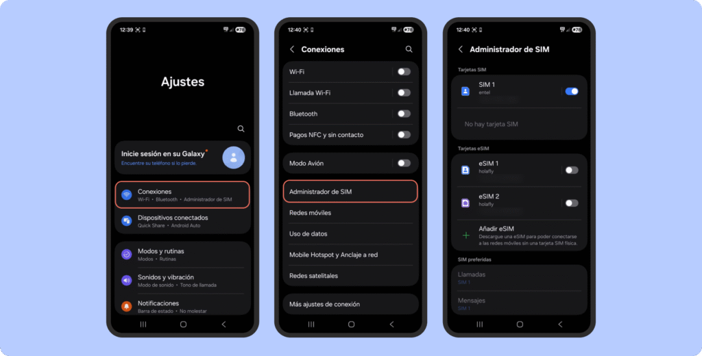 Ajustes → Conexiones → Administrador de eSIM → Añadir eSIM