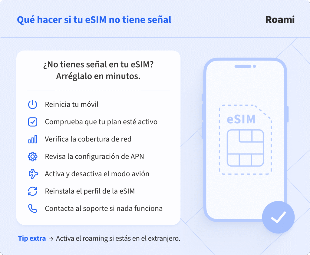 Consejo extra: si viajas, asegúrate de tener activada la opción “roaming de datos”, incluso dentro del mismo país. Algunos proveedores lo requieren para conectarse a la red.