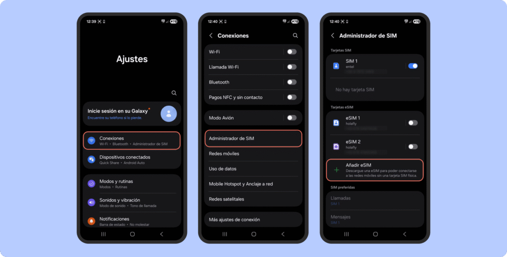 Ambas opciones terminan en el mismo proceso: tu teléfono se conecta al servidor SM-DP+ y descarga el perfil eSIM asignado a tu plan.