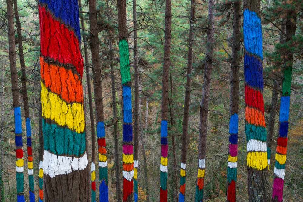 En este singular paraje, los troncos de los pinos radiata están pintados con motivos y figuras geométricas que, según el ángulo de visión, cobran vida en formas bidimensionales y tridimensionales.