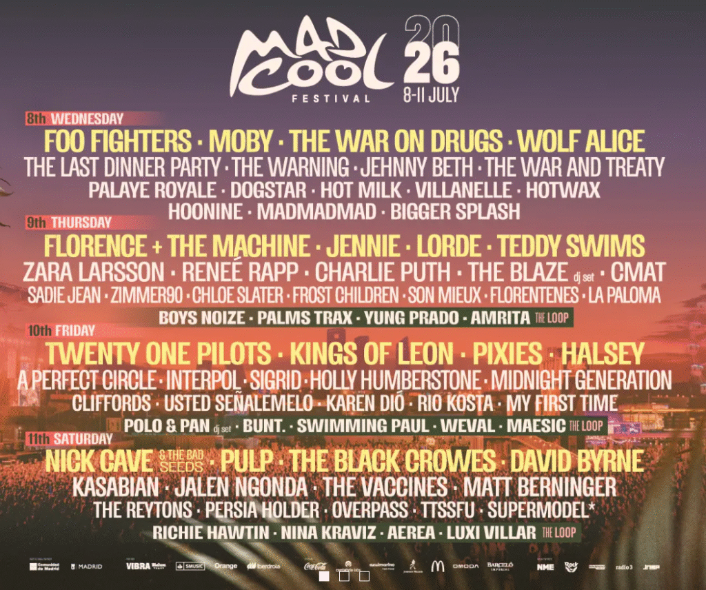| 8 al 11 de julio de 2026 | Mad Cool Festival 2026 | Iberdrola Music, Villaverde, Madrid | Rock, pop, techno, electrónica, música urbana |