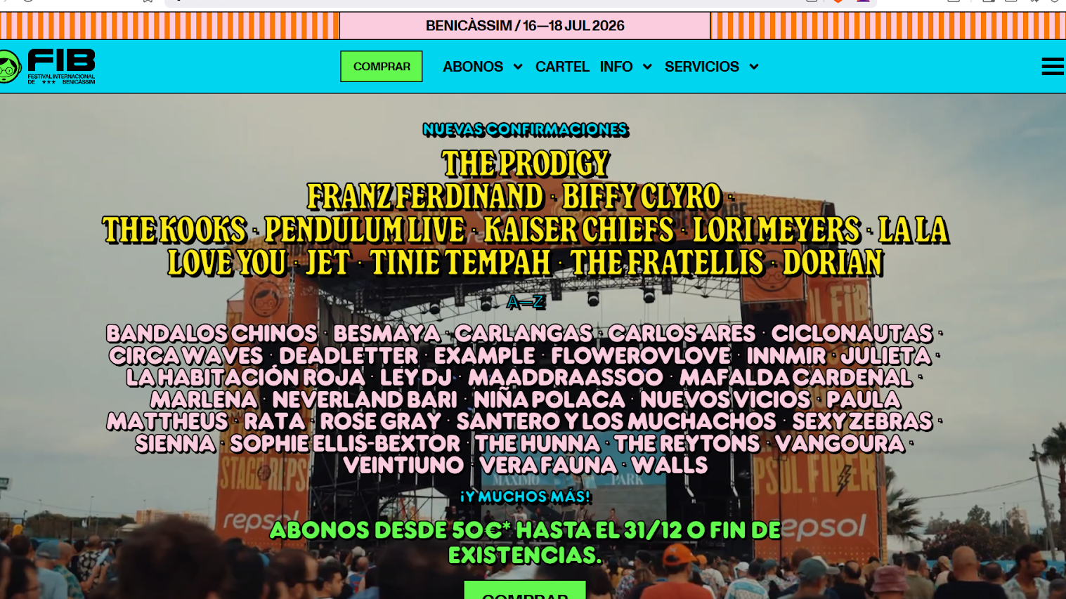 | Abono General | 50€ | Acceso al recinto de FIB Benicàssim 2026 del jueves 16 al sábado 18 de julio de 2026 | Hasta el 31/12 o fin de existencias. Gastos de gestión incluidos |