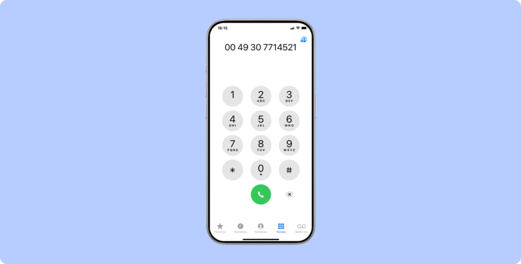 Ojo que si llamas a un número español en Alemania no tienes que marcar prefijos de ningún tipo. Solo marca el número de móvil como siempre lo has hecho, independiente de cuál sea su ubicación.