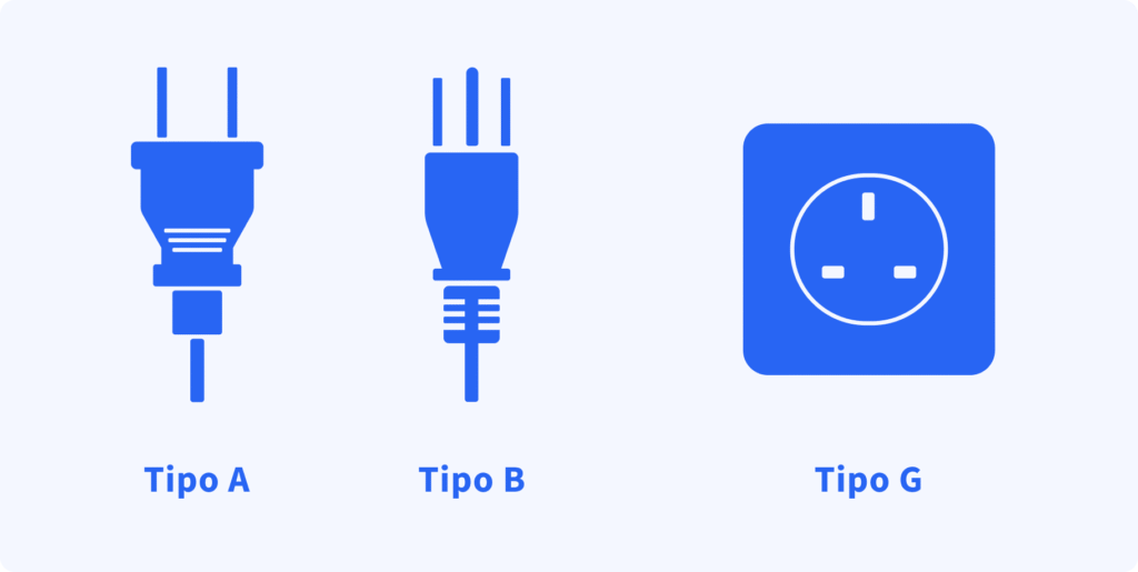 En Irlanda se utiliza el enchufe tipo G: un conector con tres clavijas rectangulares. El voltaje estándar es de 230 V a 50 Hz.