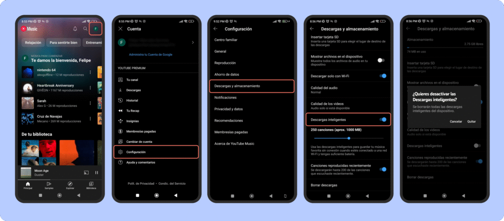 En la sección Descargas, podrás elegir activar las Descargas inteligentes. Asimismo, podrás seleccionar la cantidad de espacio que le permitirás ocupar a las descargas automáticas que realice Youtube Music.