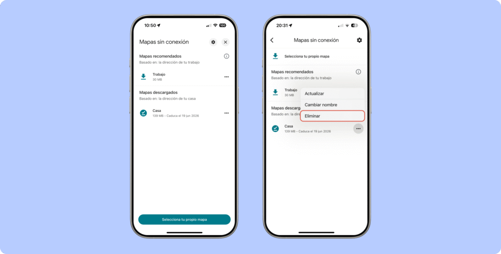 Entra en “Mapas sin conexión” > toca el mapa descargado > pulsa “Eliminar”.