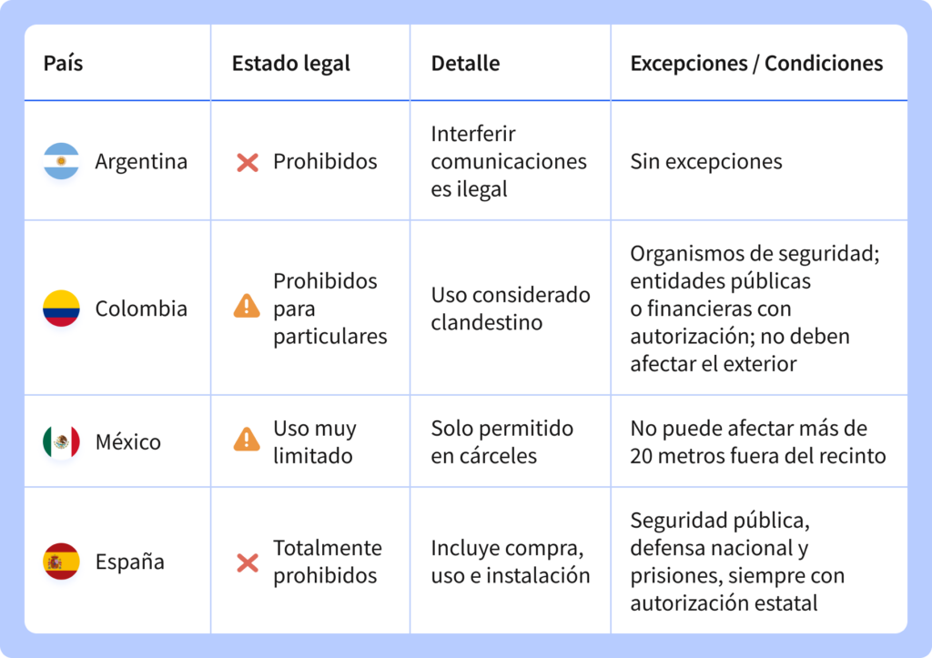 | México | IFTLey Federal de Telecomunicaciones | Solo permitido anular señales en centros penitenciarios | Uso obligatorio en cárceles y centros de readaptación social; no puede exceder 20 metros fuera del recinto |