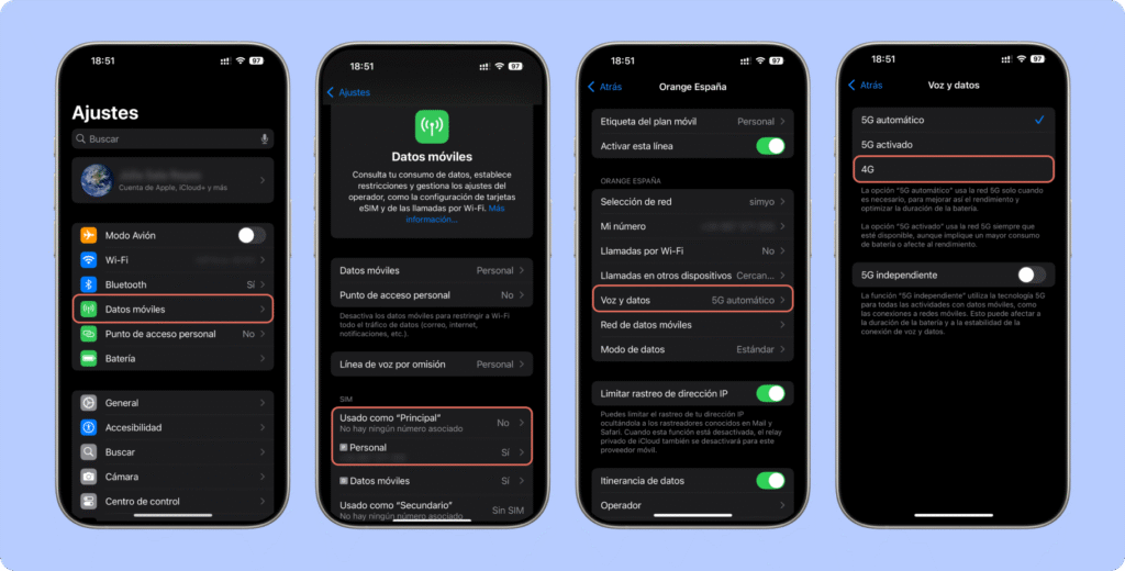 Ajustes → Datos móviles → SIM (Principal/Personal) → Selección de red → desactiva Automático y prueba otra red
