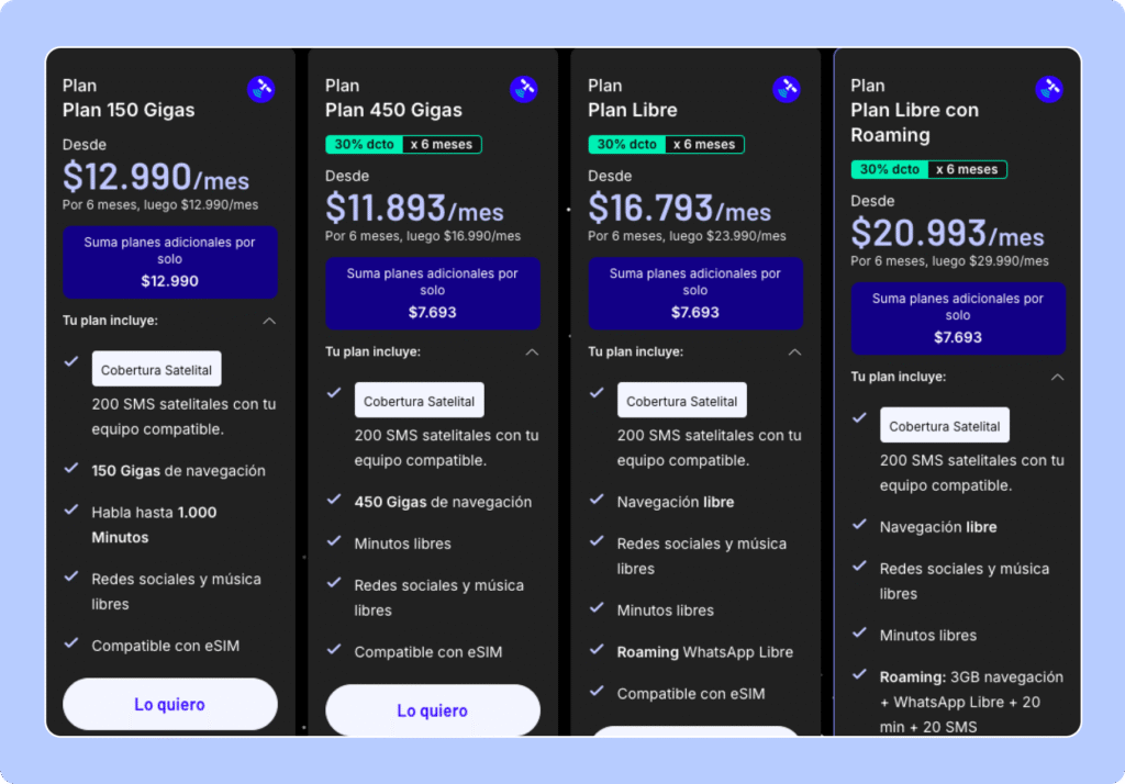 Acceso limitado para ciertos modelos de smartphones (iPhone, Samsung, Google y Motorola) en zonas sin cobertura, enfocado en mensajería y ubicación, no en internet completo.