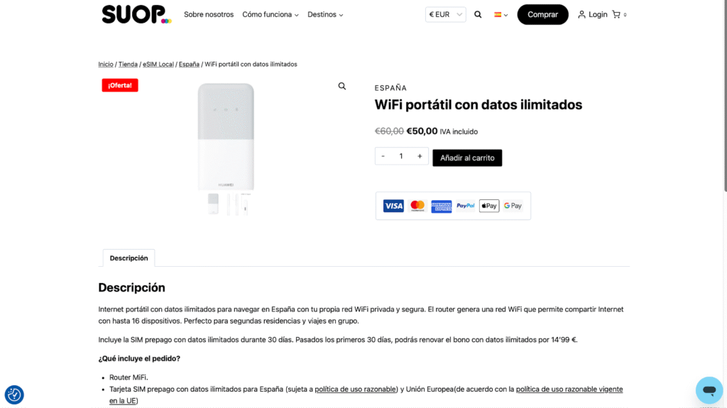 SUOP es un operador español que ofrece un router MiFi con datos ilimitados para usar en España. A diferencia de otros proveedores que alquilan por días, aquí el modelo es diferente: compras el dispositivo con una SIM prepago incluida y tienes datos ilimitados durante 30 días.