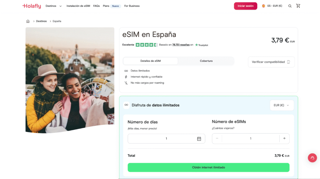 Holafly es una de las eSIM más conocidas y ofrece datos ilimitados. Es la que más tranquilidad da si no quieres estar pendiente del consumo diario (y la que yo suelo recomendar a mis amigos viajeros porque nunca falla).