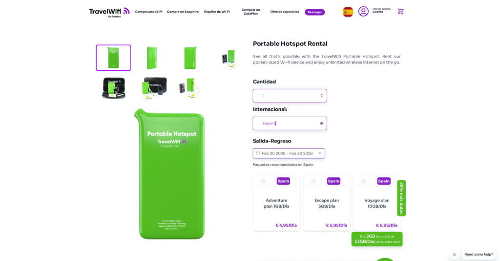 TravelWiFi es un proveedor internacional con presencia en más de 130 países. En España ofrece alquiler de hotspot portátil con varias opciones de datos diarios (1 GB, 5 GB, 10 GB o ilimitado). Es una alternativa interesante si buscas algo más flexible que el clásico “ilimitado con fair use” cerrado.