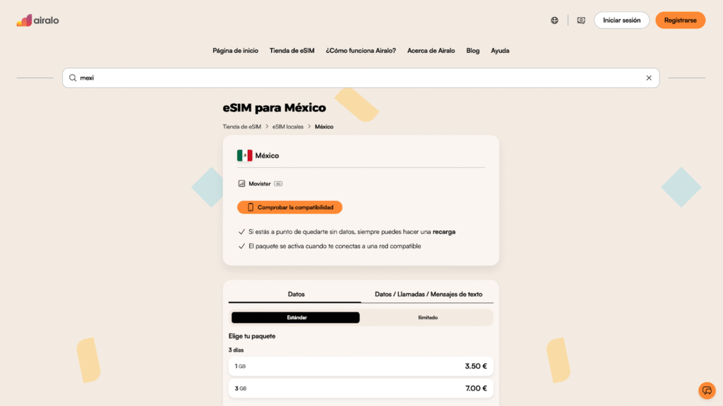 Airalo funciona por paquetes de gigas, lo que permite pagar menos si tu consumo es moderado. También ofrece datos limitados.