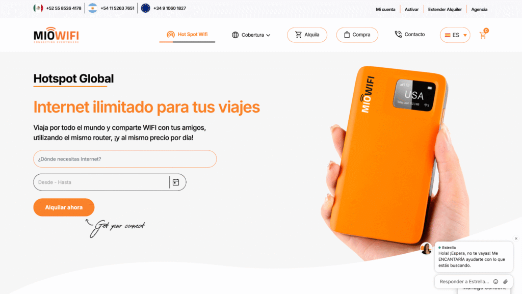 MioWiFi es un servicio de alquiler de pocket WiFi que opera en múltiples destinos internacionales, incluido México. Funciona como router portátil 4G que permite conectar varios dispositivos a la vez. Está orientado a viajeros que prefieren mantener su SIM habitual y compartir conexión entre varios móviles o portátiles.