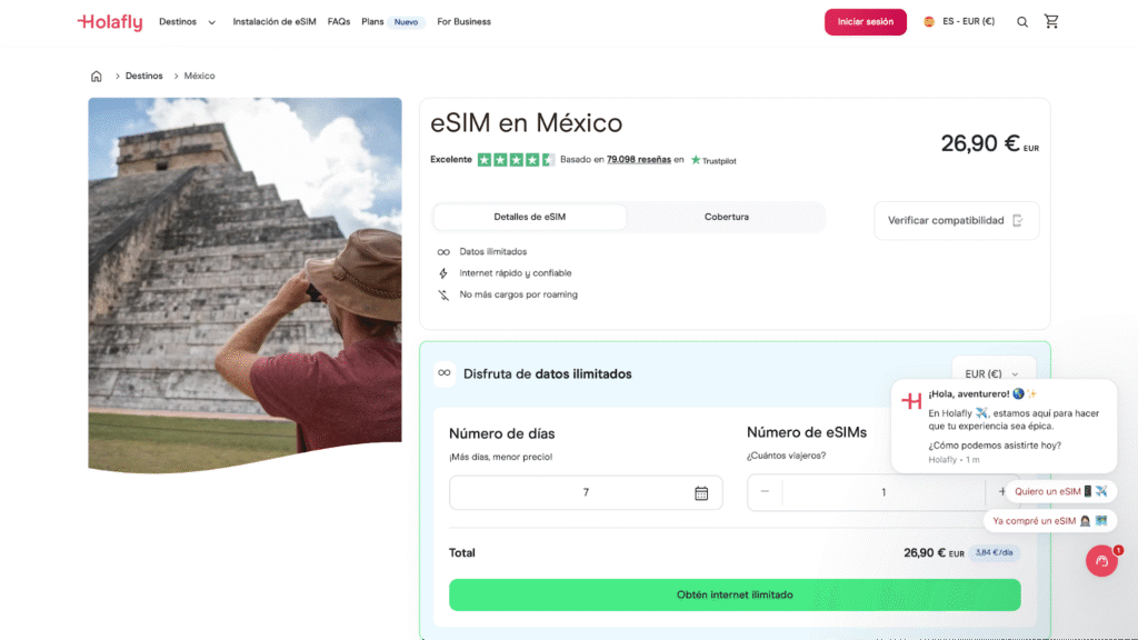 Holafly es una de las eSIM más conocidas y ofrece datos ilimitados. Es la que más tranquilidad da si no quieres estar pendiente del consumo diario (y la que yo suelo recomendar a mis amigos viajeros porque nunca falla).