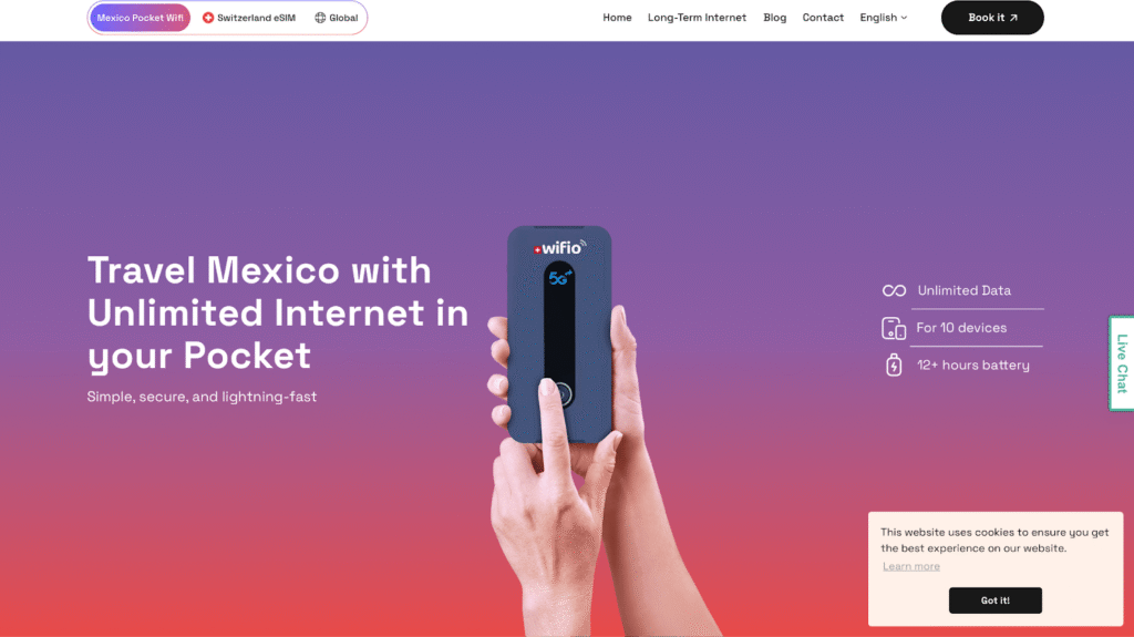 Pocket WiFi Mexico es un proveedor local que ofrece alquiler de router portátil 4G para uso dentro de México. Está orientado principalmente a turistas que llegan a Cancún, Ciudad de México o Puerto Vallarta y prefieren recoger el dispositivo físicamente en aeropuerto u hotel.