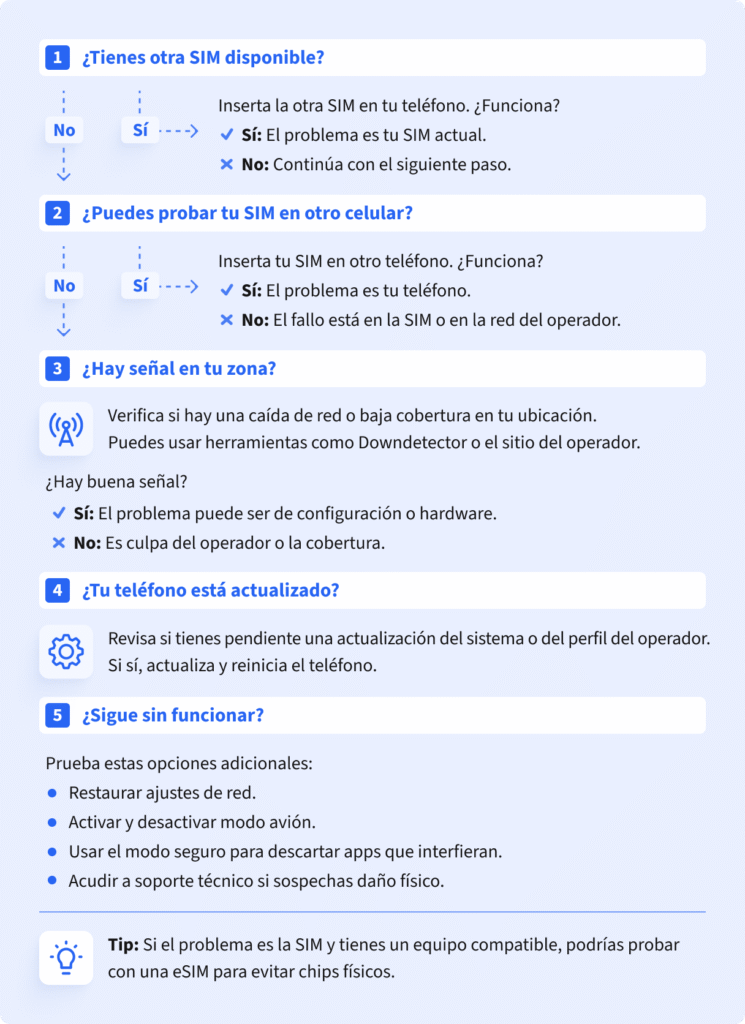 Puede deberse a fallas del operador, problemas de cobertura, una SIM dañada o errores de configuración (como modo avión activado o red mal seleccionada).