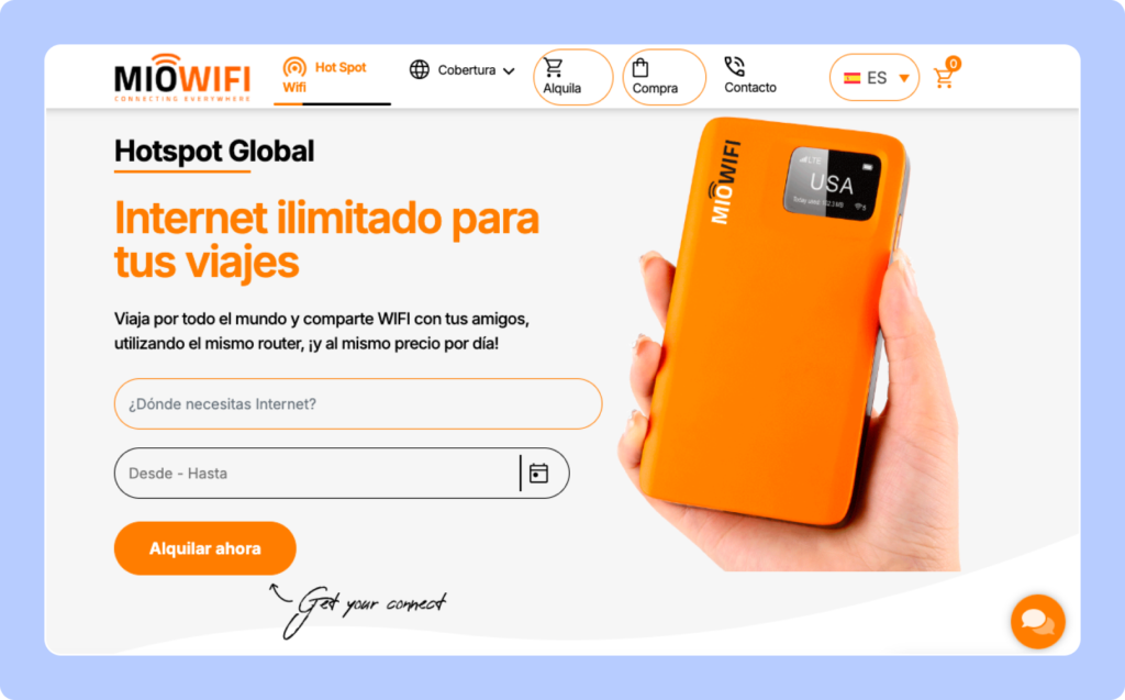 MioWiFi es un servicio de alquiler de pocket WiFi que opera en múltiples destinos internacionales, incluido países del continente europeo. Funciona como router portátil 4G que permite conectar varios dispositivos a la vez. Está pensado para viajeros que prefieren mantener su SIM habitual y compartir conexión entre varios móviles o portátiles.