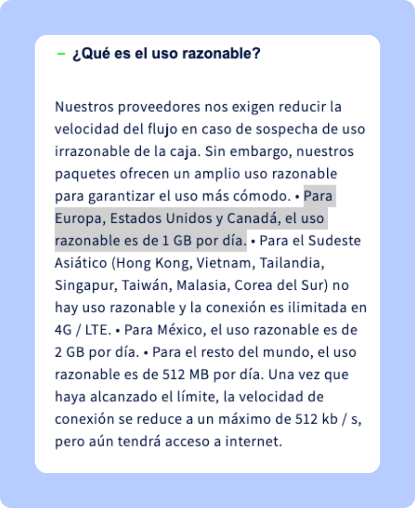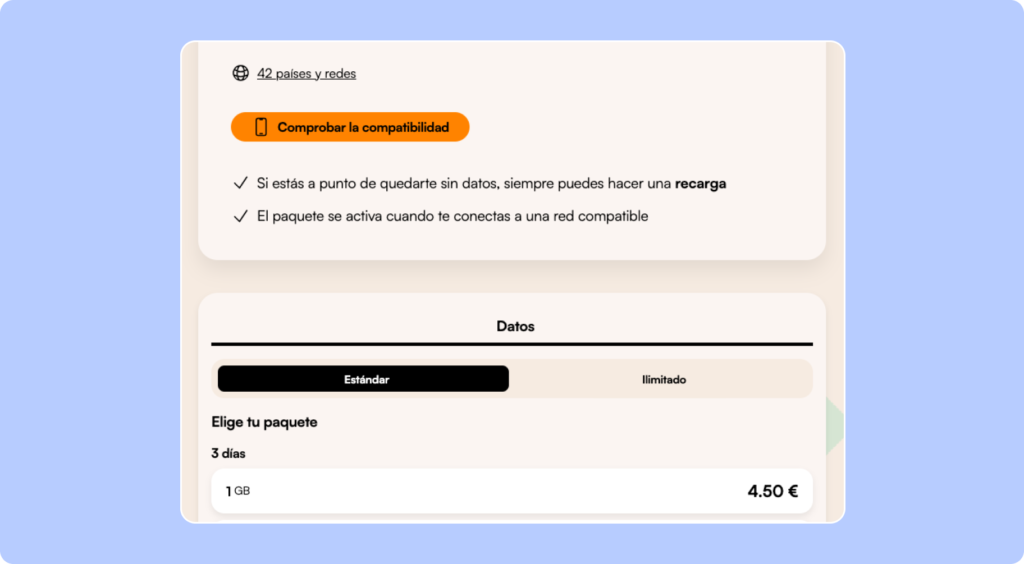 | Precio base | Desde 7,14 euros 1GB al día |