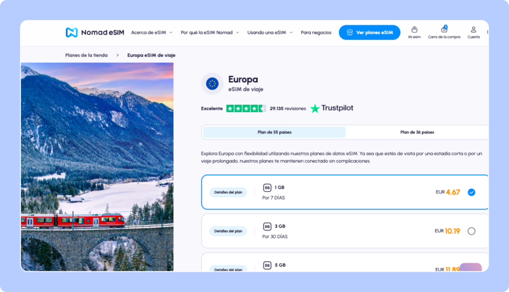 He usado Nomad eSIM cuando he querido controlar el consumo y viajar varios días pagando por GB. No es mi preferida si eliges el plan más barato porque un giga no alcanza para siete días, pero el desempeño de la app es bastante bueno.