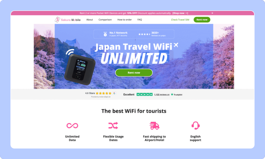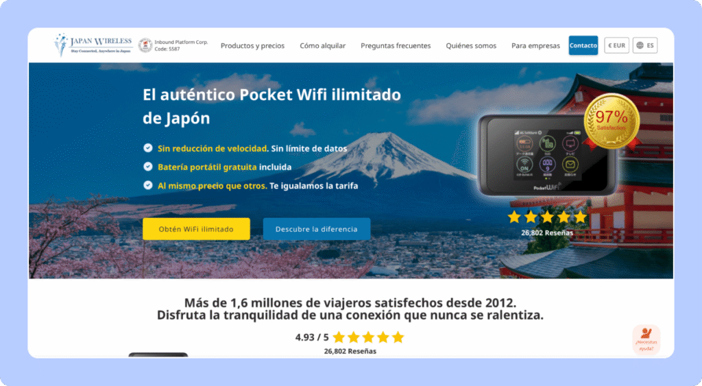 Uno de los proveedores históricos de pocket WiFi en Japón, operando desde 2012. En su web destacan más de 1,6 millones de viajeros y una valoración media de 4,93/5 basada en más de 26.000 reseñas.