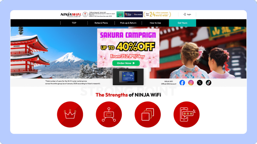 Ninja WiFi es uno de los proveedores con mayor presencia física en Japón. Destacan por su red amplia de recogida en aeropuerto y opciones de smart pickup.