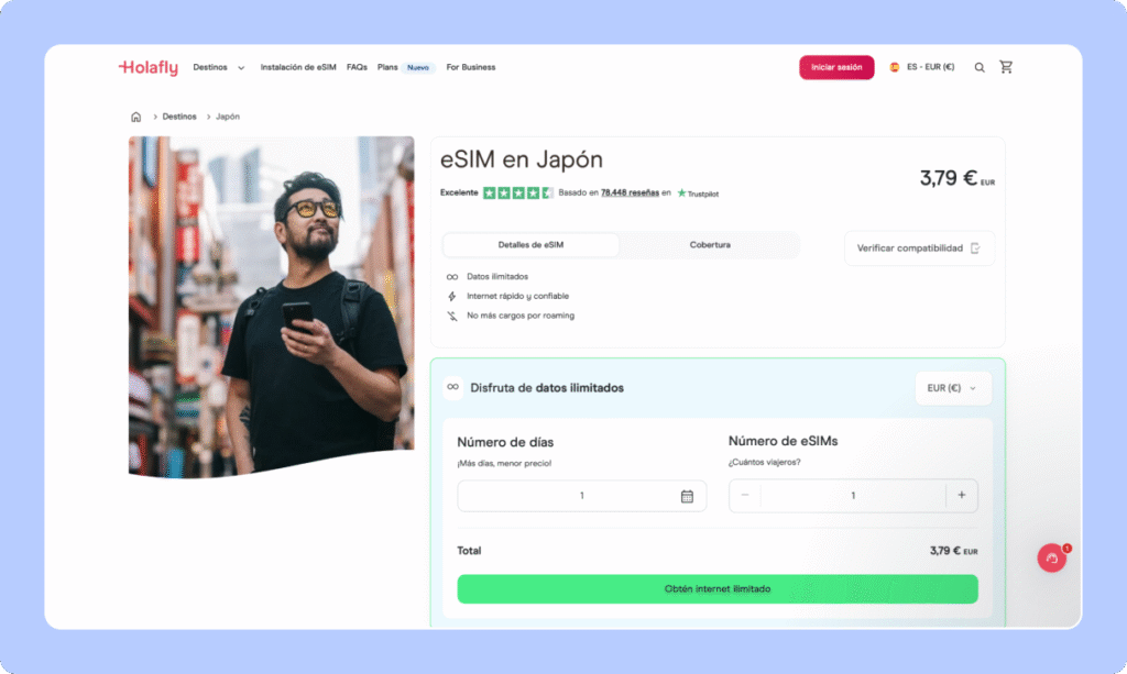 Holafly es una de las eSIM más conocidas para Japón y suele apostar por datos ilimitados. Es la que más tranquilidad da si no quieres estar pendiente del consumo diario (y la que yo suelo recomendar a mis amigos viajeros).