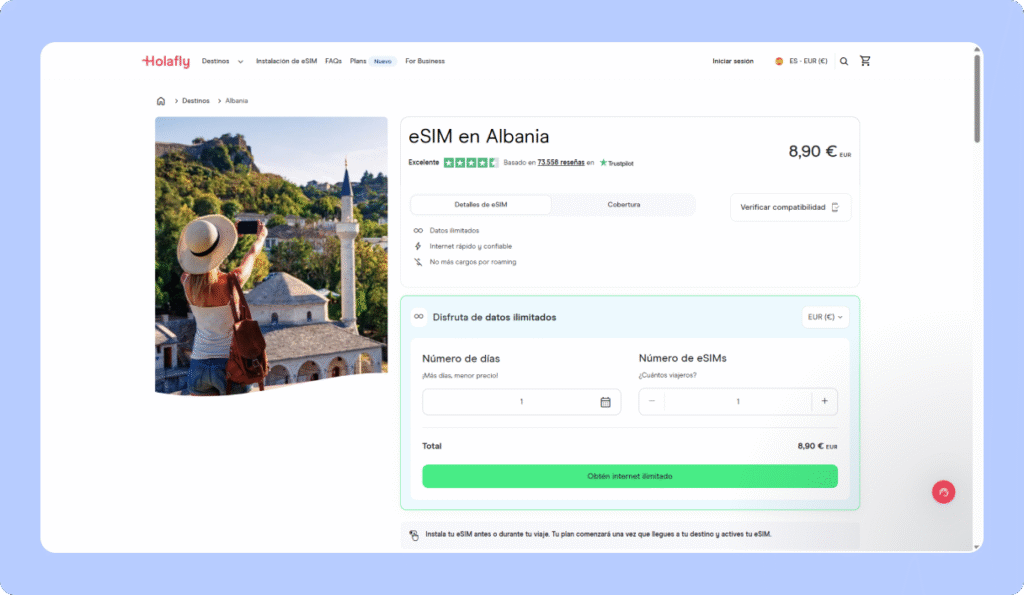 Holafly es la mejor opción si necesitas datos ilimitados en Albania, valoras una activación sencilla y quieres contar con soporte en español durante todo tu viaje.