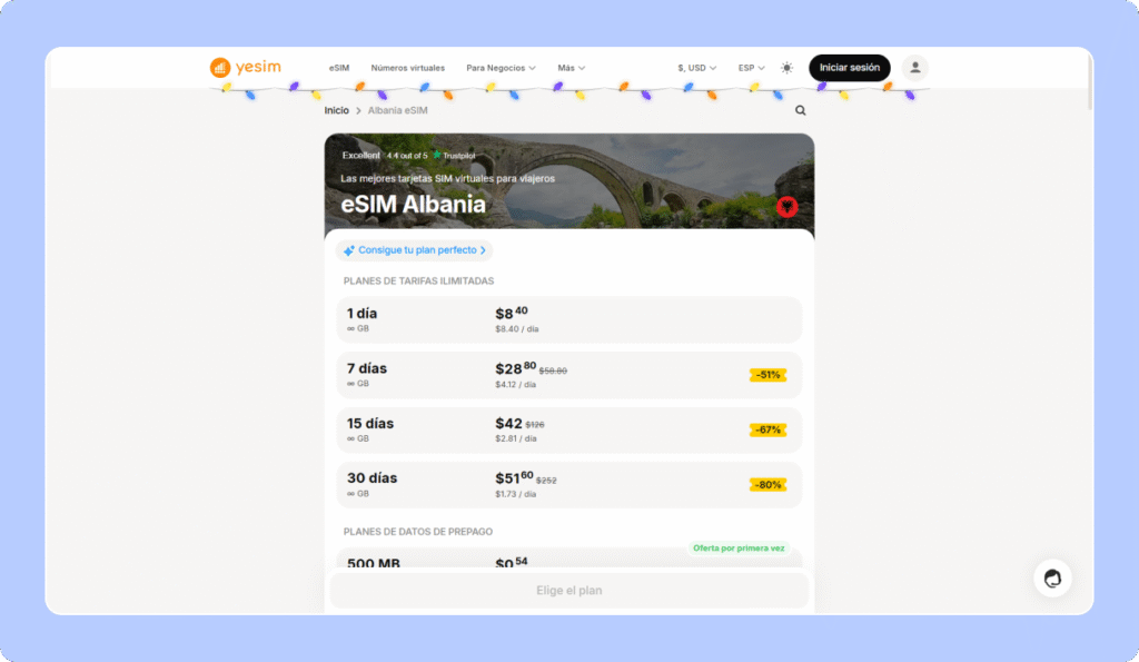 El precio de una eSIM para Albania suele oscilar entre 3 € y 50 €, dependiendo de la duración del plan y de la cantidad de datos incluidos. Los planes ilimitados son más caros, pero ofrecen mayor tranquilidad durante el viaje.