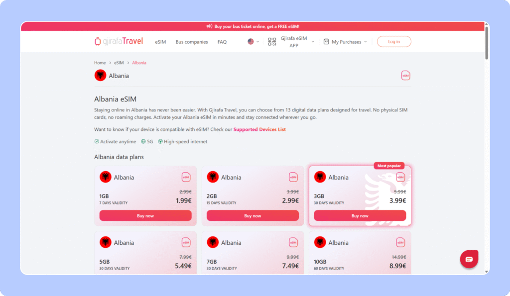 Gjirafa eSIM es una alternativa atractiva si buscas una eSIM económica y con una amplia variedad de planes de datos para viajar por Albania. La compañía opera desde los Balcanes Occidentales y ofrece eSIM diseñadas tanto para estancias cortas como para viajes de mayor duración, con opciones flexibles según tus necesidades de consumo.
