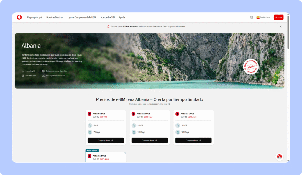 Vodafone es una buena elección si buscas una eSIM con respaldo de operador local, buena cobertura y muchos GB, y no necesitas datos ilimitados ni roaming en otros países.