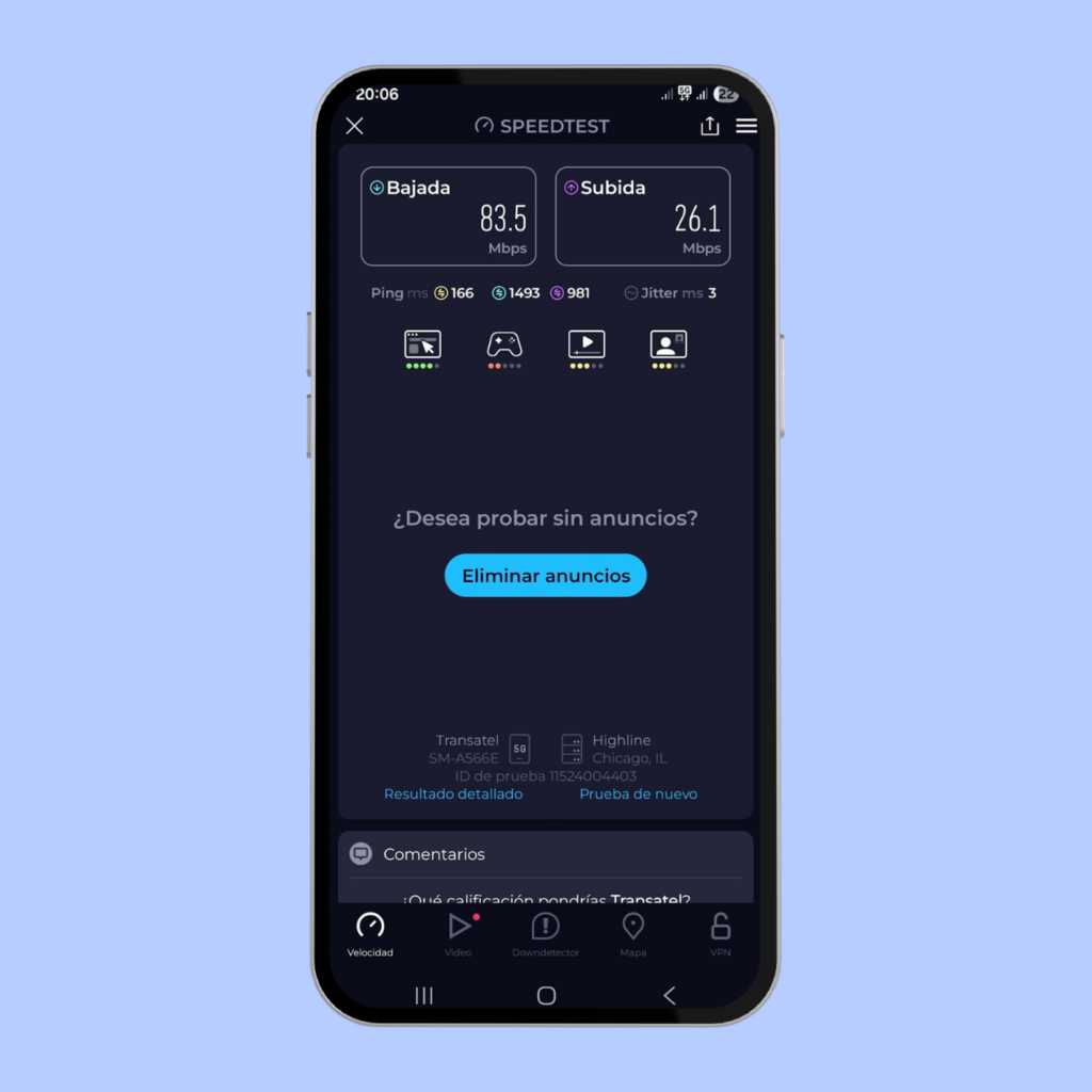 La velocidad registrada fue menor a la que tenía al realizar la prueba directamente en el móvil. A pesar de esto, la velocidad fue suficiente para todo lo que necesite hacer.