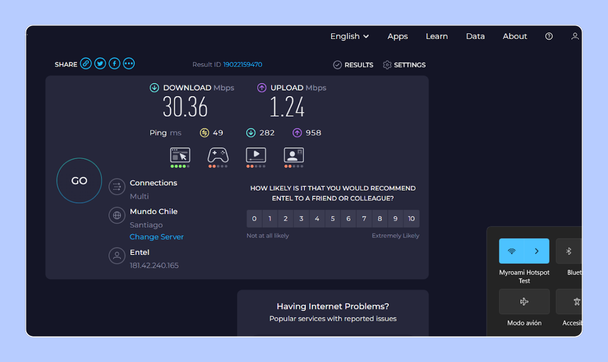 Realicé el test de velocidad desde mi oficina, ubicada en la comuna de Ñuñoa. La prueba fue realizada a través del Speedtest de Ookla, en su formato app.