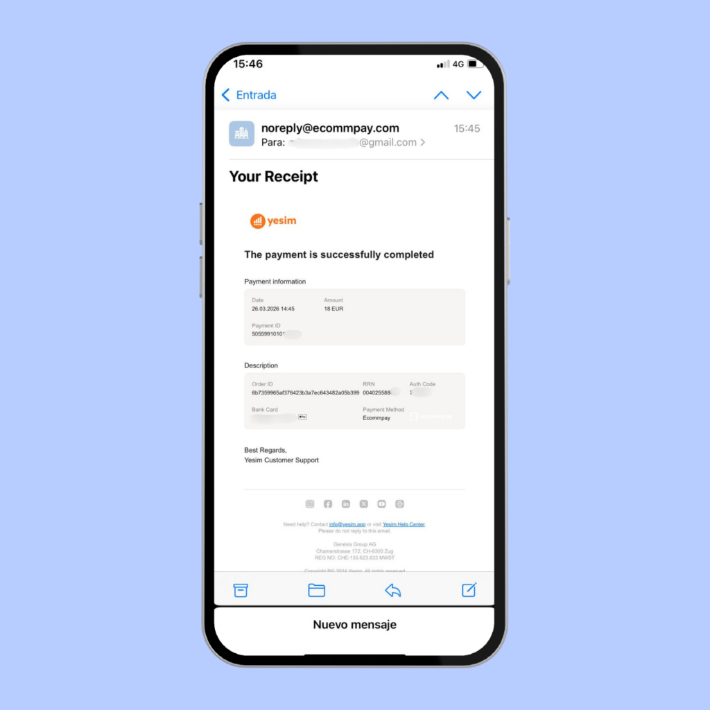 Compré la eSIM en la página web de Yesim. De forma instantánea recibí un mail con la confirmación y un QR para activar. También existe la opción de bajar la app y activar ahí.